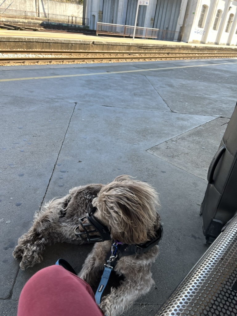 One of the less fun parts of traveling by train here is that any dog that’s not in a carrier is required to wear a muzzle. I’m not sure whether that applies to recognized service dogs, but I didn’t (and still don’t) have the documentation for Mo to qualify as one here.